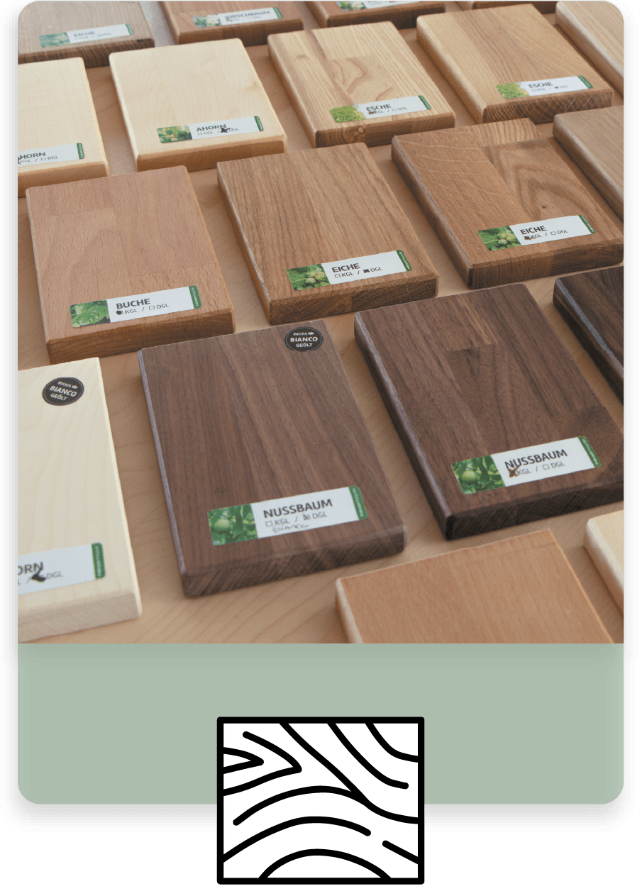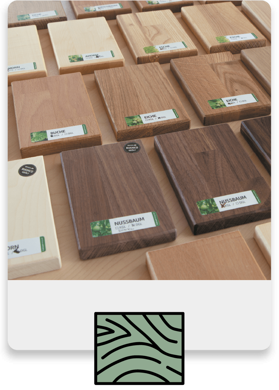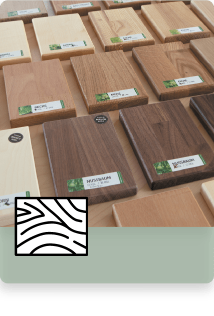 Bei Frohraum können Sie zwischen acht unterschiedlichen Holzarten wählen: Ahorn, Buche, Kernbuche, Esche, Eiche, Wildeiche, Nussbaum und Kirschbaum.