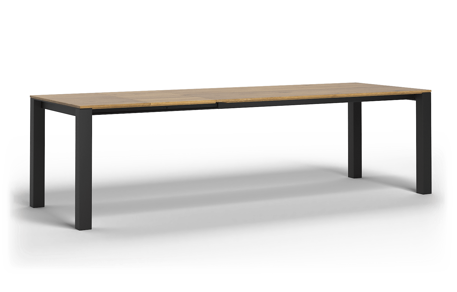 Das Modell ET410-KA vereint ausgefeilte Funktion mit markantem Design. Das innovative Aluauszugssystem ist mit Flachklappmechanik ausgestattet und sorgt mit einer Zargenhöhe von nur 50 mm für maximale Beinfreiheit. Dies ermöglicht auch mit Armlehnenstühlen komfortables Sitzen. Die lichte Höhe unter der 25 mm starken Massivholzplatte beträgt lediglich etwa 80 mm unterhalb der Tischhöhe – ideal für großzügigen Sitzkomfort.