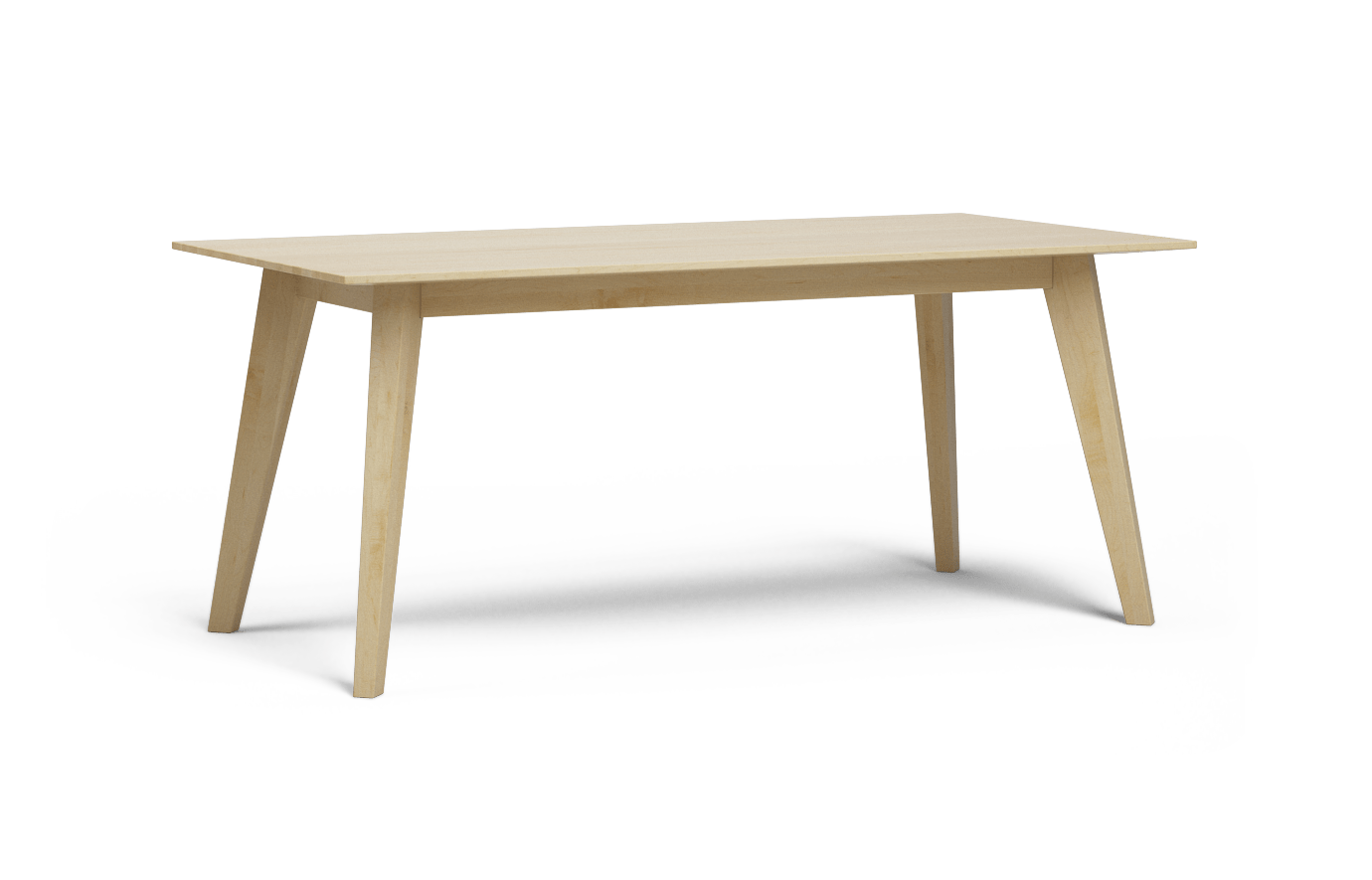 Zunächst erhält die Tischplatte durch die „Schweizerkante“ ihre prägnante Form. Dabei wird die Platte auf der Unterseite angeschrägt und wirkt dadurch schlank ohne nennenswert an Robustheit einzubüßen. So gewinnt die Platte einen guten Überstand gegenüber den Tischbeinen, die in Richtung Unterseite verjüngend, um 10° angewinkelt und um 45° gedreht, verlaufen.